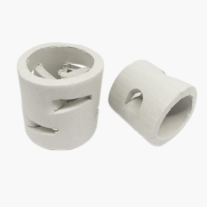 陶瓷鮑爾環(huán)填料是在陶瓷拉西環(huán)的基礎上開發(fā)的一種高徑相等的開孔環(huán)型填料,每層窗孔有5個舌葉,每個舌葉內彎指向環(huán)心,上下兩層窗孔的位置相反錯開,一般開孔面積約占環(huán)壁總面積的30%左右,使得填料塔內的氣體和液體能夠從窗孔自由通過,改善了氣液分布,充分利用了環(huán)的內表面。