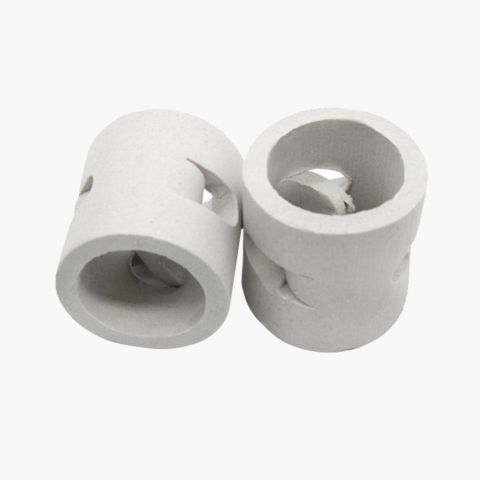 陶瓷鮑爾環(huán)填料是在陶瓷拉西環(huán)的基礎(chǔ)上開發(fā)的一種高徑相等的開孔環(huán)型填料,每層窗孔有5個舌葉,每個舌葉內(nèi)彎指向環(huán)心,上下兩層窗孔的位置相反錯開,一般開孔面積約占環(huán)壁總面積的30%左右,使得填料塔內(nèi)的氣體和液體能夠從窗孔自由通過,改善了氣液分布,充分利用了環(huán)的內(nèi)表面。