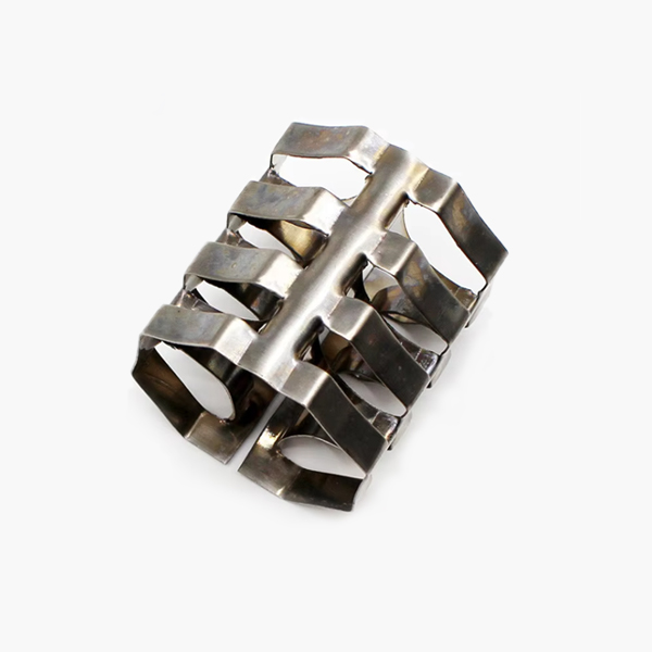 金屬八四內(nèi)弧環(huán)填料,也稱麥勒環(huán)填料,是一種新型高效金屬散堆填料,該填料有合理的幾何對稱性,構(gòu)造均勻性好及高的空隙率,八弧卷與四弧圈順軸向交替安排,名弧段沿徑向環(huán)內(nèi)折進,從而使填料表面連續(xù)而不斷開,且在空間均勻分布,與鮑爾環(huán)相比,通量可提高15-30%,壓降減小20-30%。
