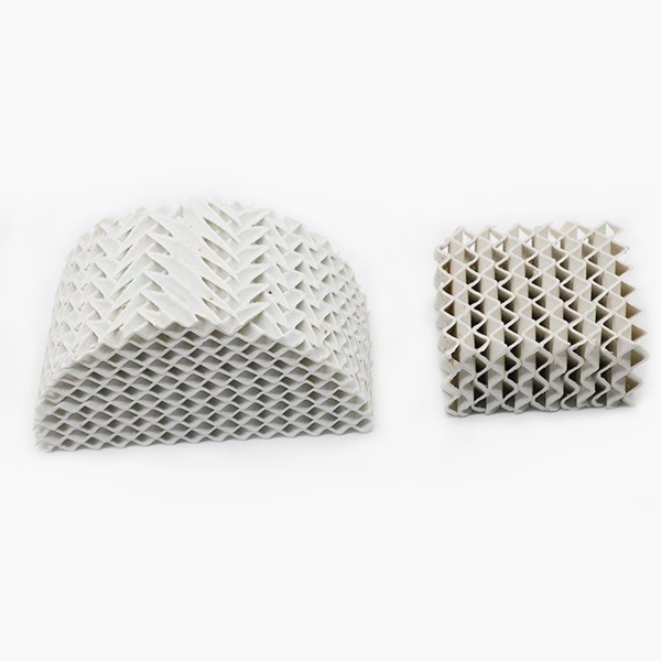 陶瓷波紋填料是一種新型規(guī)整填料,它是由許多具有相同幾何形狀的填料單元體組成。由于陶瓷獨特的結(jié)構(gòu),具有良好的親水性能,其表面可形成極薄的液膜的湍動及氣流的傾斜曲折通道能促進(jìn)氣流但又不阻擋氣流使陶瓷填料能與金屬填料相匹敵,而其耐腐蝕、耐高溫性能金屬填料卻無法相比。表面結(jié)構(gòu)有良好的濕潤性能,能使液體加快流動、使填料滯液量降至最低。從而降低了過熱、聚合和結(jié)焦的機會。