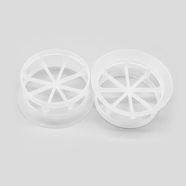 塑料階梯環(huán)填料的側(cè)端增加了翻邊,不但可以增加填料環(huán)的機械強度,而且由于破壞了填料結(jié)構(gòu)的對稱性,因而增加了填料投放時的定向幾率。又由于翻邊的影響,使得填料在堆積時填料環(huán)隙之間的接觸由此線性接觸為主變?yōu)橐渣c接觸為主。這樣,不但增加了填料顆粒之間的空隙,減少了氣體穿過填料層的阻力,而且這些接觸點還可以為液體沿填料表面流動的匯聚分散點,從而促進了液膜的表面更新,有利于填料傳質(zhì)效率的提高。